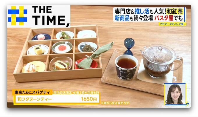 さらに、『東京たらこスパゲティ 南池袋店』(東京・豊島区)では、9種類の和菓子と和紅茶を楽しめる「和フタヌーンティー」(1650円※午後2時~午後6時)。春からは他の店舗でも販売する予定です。