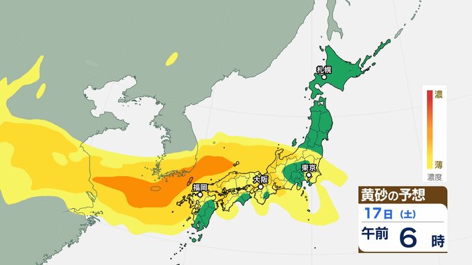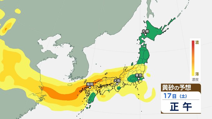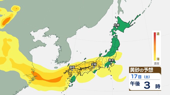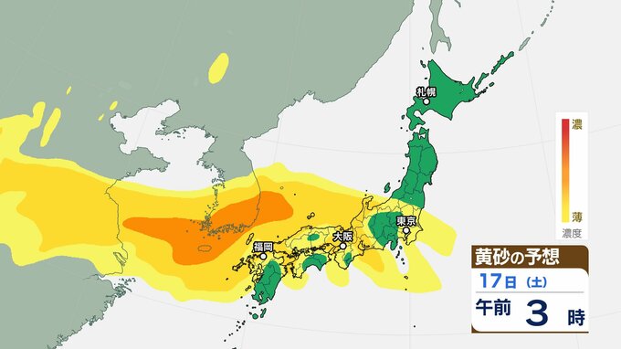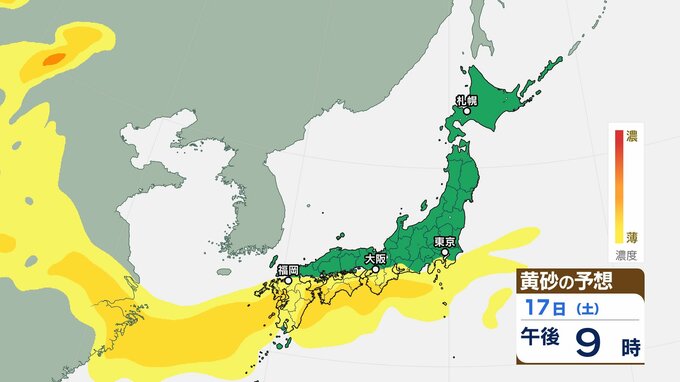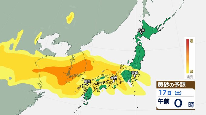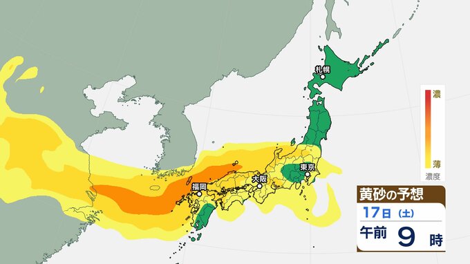 【黄砂情報】日本列島に季節外れの「黄砂」飛来 16日(金)~18日(日)にかけて九州・中国・四国・近畿・北陸・東海・関東甲信・東北の一部に影響か 屋外の洗濯物やアレルギー対策などに注意 黄砂シミュレーション【気象庁 16日午前9時更新】 RSK山陽放送 2026年1月16日(金) 09:06 国内 天気 17日(土)の黄砂はどうなる? 17日(土)は【画像6~】の通りです。九州地方・中国地方・四国地方・近畿地方・北陸地方・東海地方、関東甲信地方・東北地方の広い範囲に飛来する可能性があります。 画像6 画像7 画像8 画像9 画像10 画像11 画像12 画像13