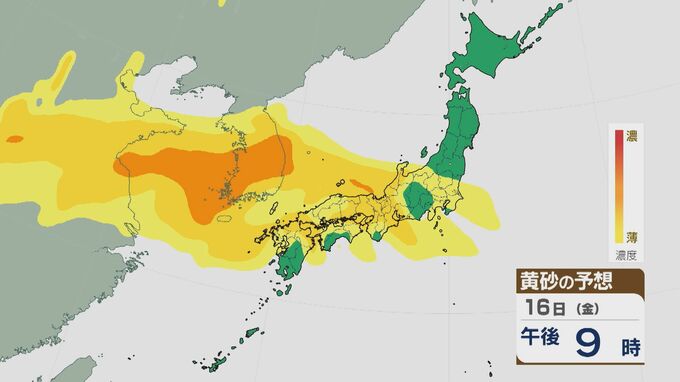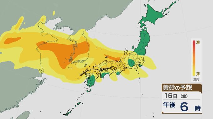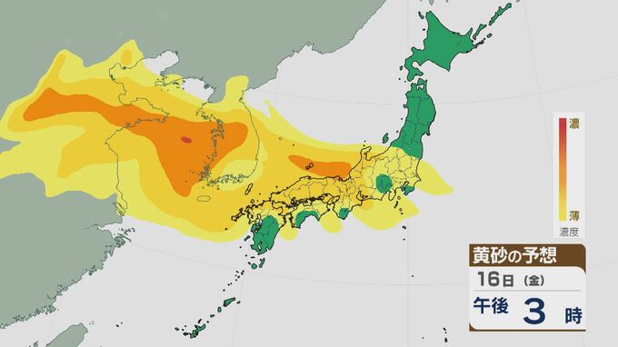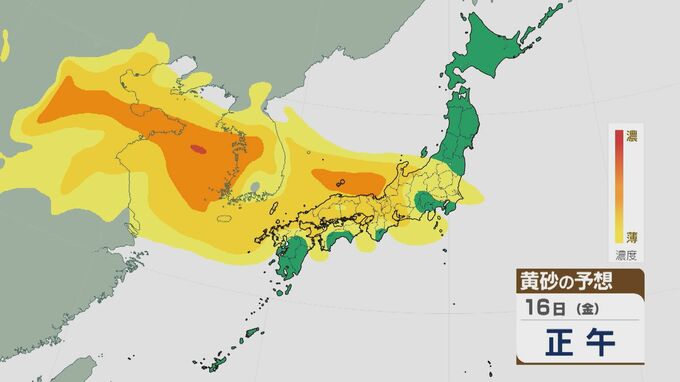 【黄砂情報】大陸からの“季節外れの黄砂” ピークは16日(金)の日中に 17日(土)にかけて九州から東北南部にかけて飛来の見込み 最新の飛来予想シミュレーション 北陸放送 2026年1月16日(金) 09:16 国内 16日の黄砂の飛来予想ですが、日中は九州北部から関東にかけて飛来し、中国地方や近畿北部、東海・北陸などでは比較的濃度が高くなっています。