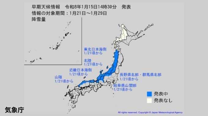 気象庁はきのう(15日)「気温」と「降雪」に関する早期天候情報を発表しました。