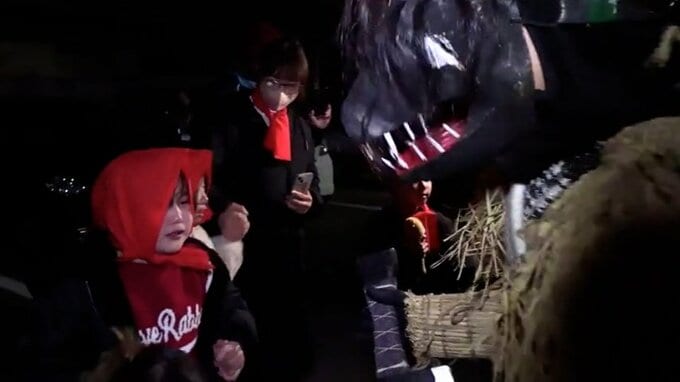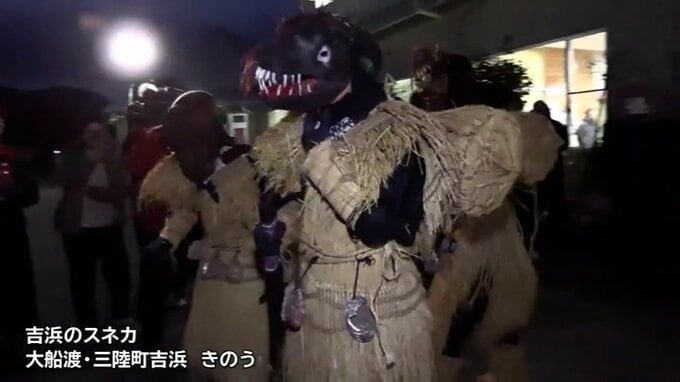 大船渡市三陸町の三陸鉄道吉浜駅前に現れたのは、蓑をまとい、「キリハ」と呼ばれる刃物を手に獣のような恐ろしい面をつけた「スネカ」です。