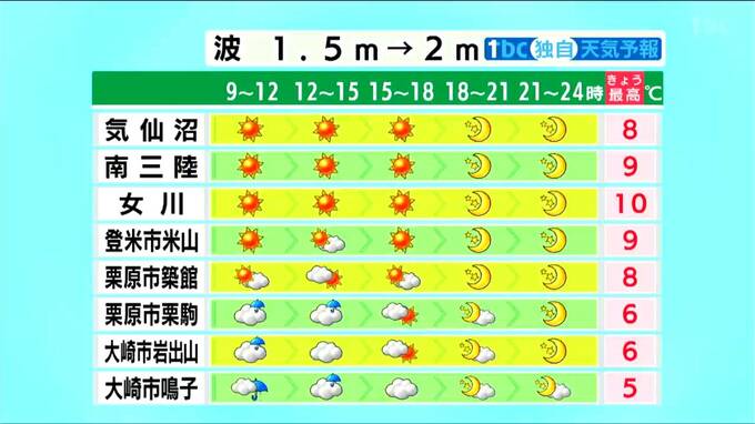 ■女川:最高気温10℃ ■登米市米山:最高気温9℃