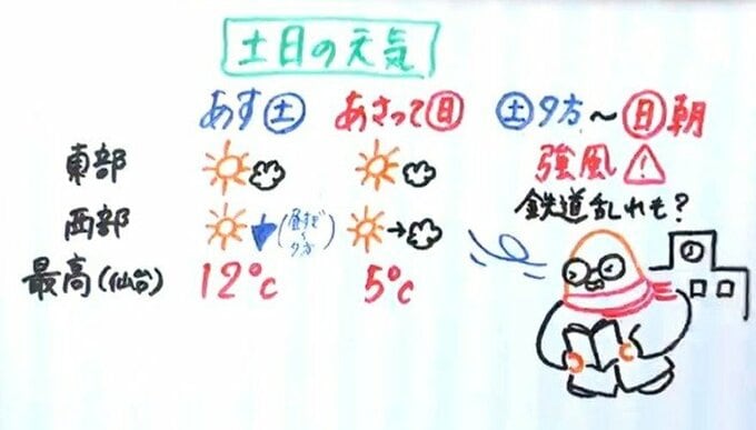 土曜日は晴れ間が広がりますが、午後には小さな低気圧が通過していくため、昼過ぎから夕方にかけて西部を中心に弱い雨がありそうです。17日は16日以上に気温が高く、最高気温は仙台で12℃まで上がる予報となっています。