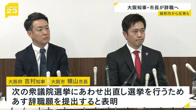 大阪府の吉村知事と、大阪市の横山市長は衆議院の解散にあわせて出直し選挙に臨むため、16日辞職すると正式に表明しました。 15日夜、大阪府の吉村知事と大阪市の横山市長は、来月にも実施される見込みの衆議…