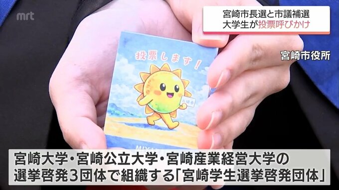 今月25日に投開票が行われる宮崎市長選挙と市議会議員補欠選挙の投票率アップを図ろうと大学生が投票を呼びかけました。「選挙啓発活動でオリジナルカードを作ったので、よろしければどうぞ。ありがとうございます…