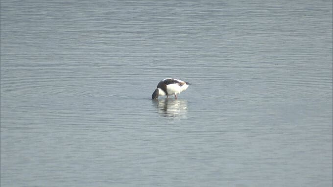 「ツクシガモがくちばしを海の中につけて、えさを食べていました」