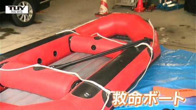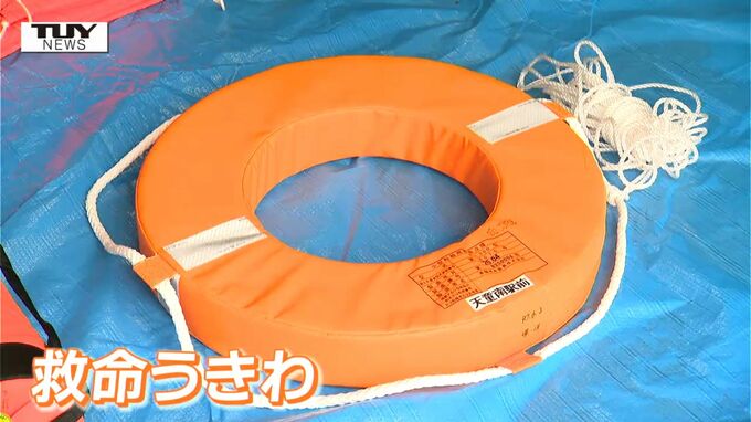 おぼれた人に投げてロープで引っ張り救助する「スローバック」や「救命浮環」。被災者を救出する救命ボート。