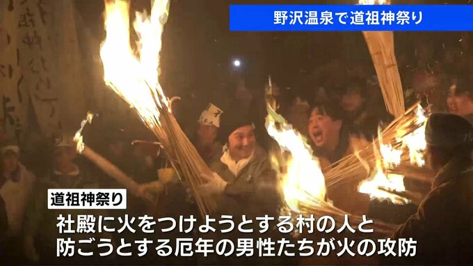 長野県野沢温泉村の道祖神祭り。厄除けなどを願い、江戸時代から続く火祭りです。社殿に火をつけようとする村の人と、それを防ぐ厄年の男性たちが激しい攻防を繰り広げました。社殿は、およそ1時間のせめぎ合いの…