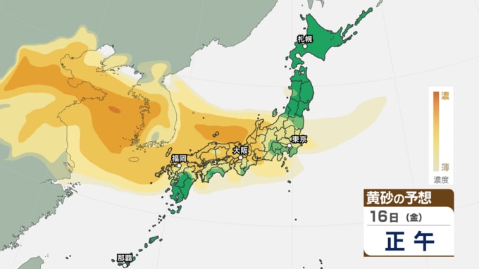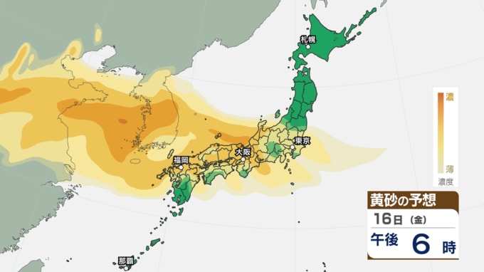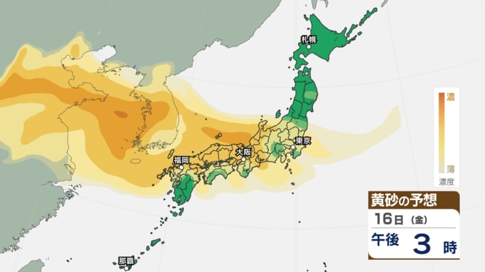 画像で掲載している黄砂シミュレーションでは、16日(金)は九州から中国、四国、近畿、北陸、東海、関東甲信、東北南部まで黄砂が予想されています。