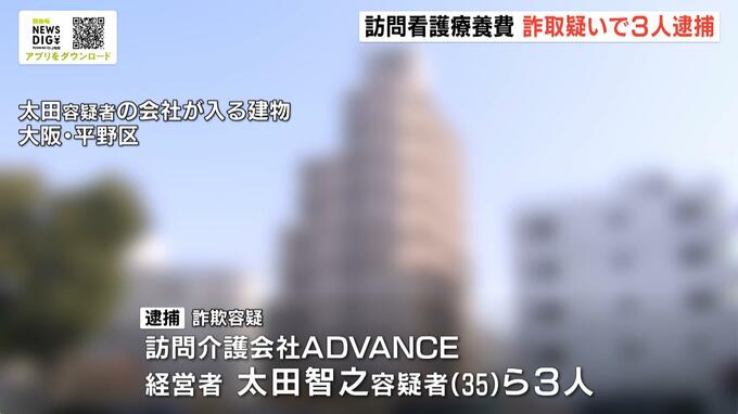 訪問看護療養費を水増し請求しだましとったとして、訪問介護会社の代表ら3人が逮捕されました。 詐欺の疑いで逮捕されたのは、大阪市平野区の訪問介護会社「ADVANCE」の代表・太田智之容疑者(35)ら男…