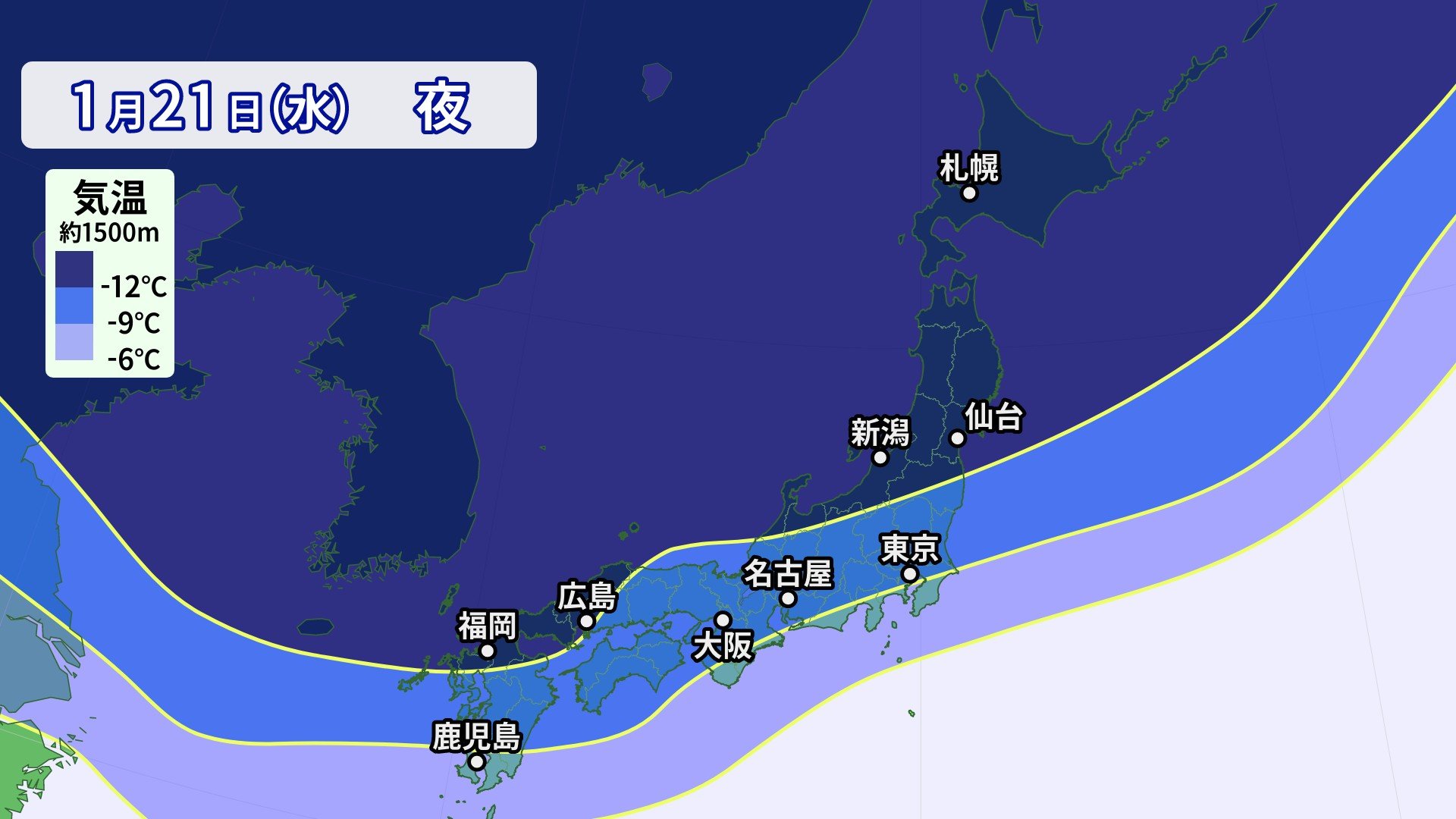 21日(水)には、東京、大阪、名古屋まで-9℃以下というさらに強い寒気が流れ込むほか、北日本や北陸、さらに西日本の広島、福岡には、もっと強い-12℃以下の寒気が入ります。雪雲の流れ込み次第では、大雪になるおそれがあり、交通に影響が出てもおかしくありません。