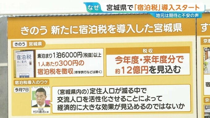 1月13日から新たに宿泊税を導入した宮城県は、素泊まり料金が6000円以上の宿泊客から1人1泊あたり300円を徴収し、今年度・来年度合わせて約12億円の税収を見込んでいます。