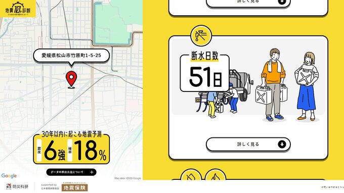 防災が専門の、愛媛大学防災情報研究センター二神透副センター長と試しました。あいテレビのある松山市竹原町は、30年以内に震度6強の地震が起こる確率18%。断水は51日にもおよぶとのこと。