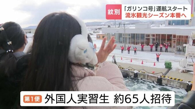 第一便には紋別市内の水産加工場などで働く外国人実習生が招待され、船に乗り込みました。