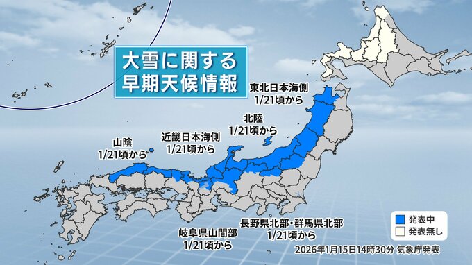 気象庁は15日、「低温と大雪に関する早期天候情報」を発表しました。