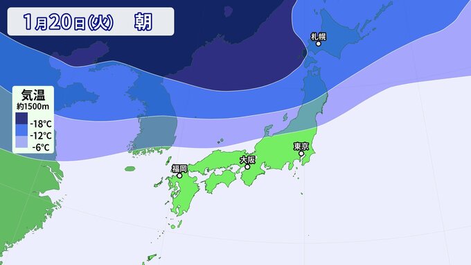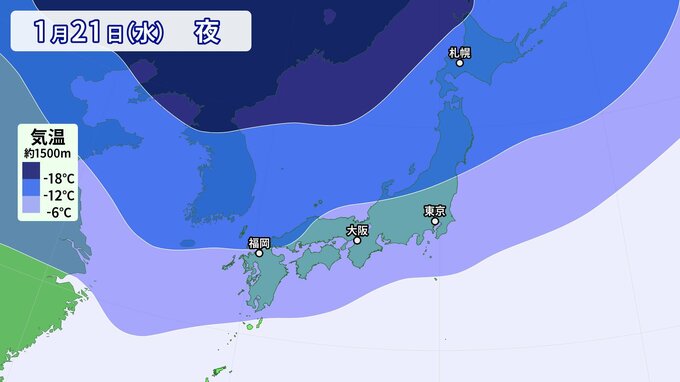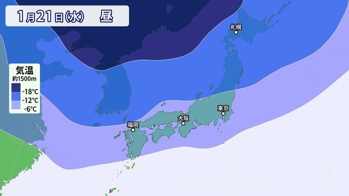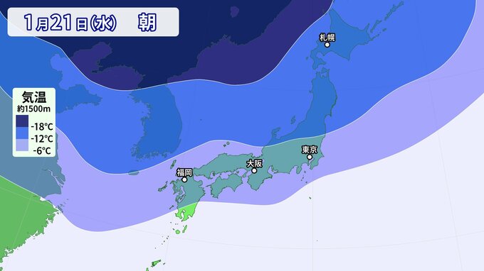 21日(水)は、上空約1500メートルでマイナス6℃以下(平地で雪が降る目安)の強い寒気が本州をすっぽりと覆う見込みです。
