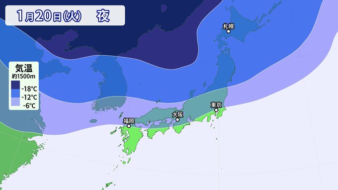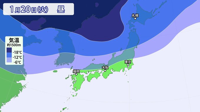 20日(火)頃から日本付近は次第に冬型気圧配置となり、上空に強い寒気が流れ込み始めるでしょう。