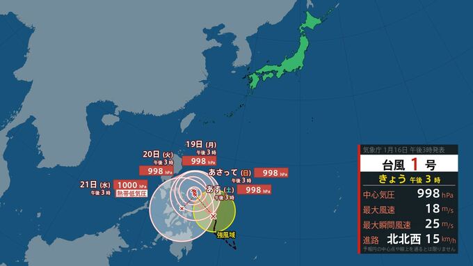 気象庁によりますと、台風1号は、【画像①】のように、午後3時現在、フィリピンの東を時速15kmの速さで北北西へ進んでいます。
