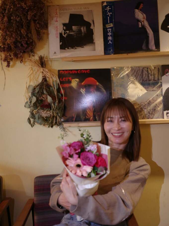 別の写真では、カフェのような場所で花束を手に、笑みを浮かべる新山さん。