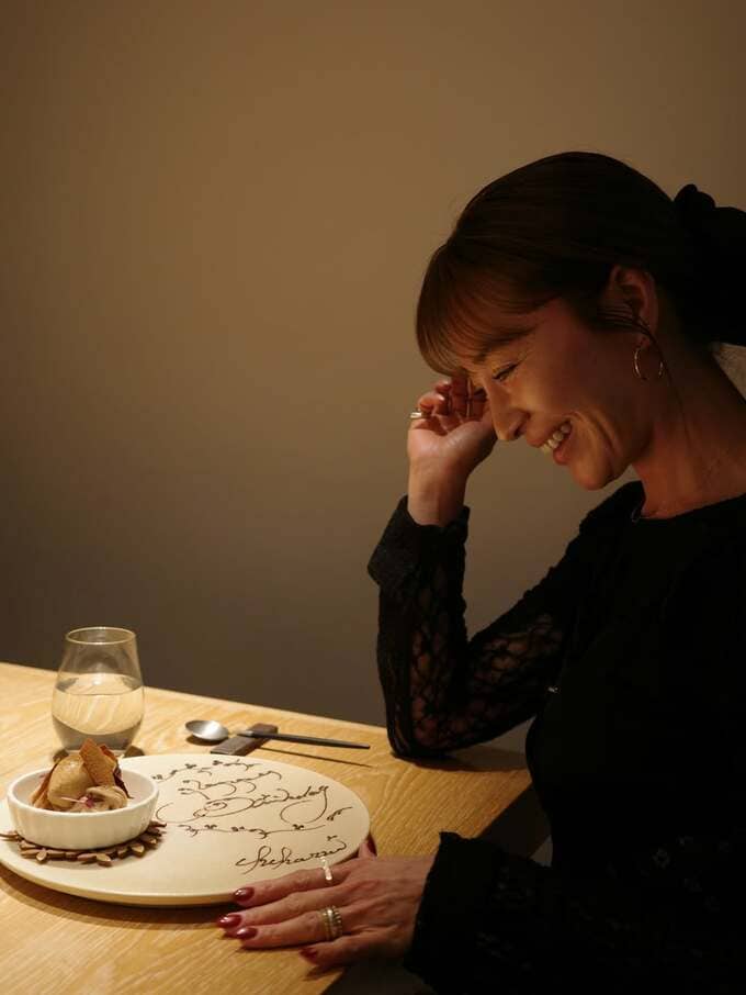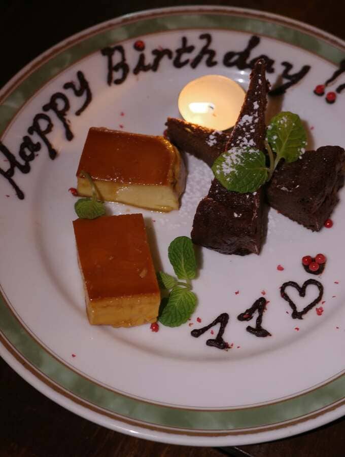 また別のデザートの写真には、プリンとチョコレートケーキのプレートが。娘さんからのプレゼントなのか、「Happy Birthday!! ママ」と書かれています。