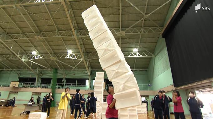 高校生が積んでいるのは、発泡スチロールの箱。16日、裾野市の高校生が挑戦したのは、発泡スチロールの箱をどこまで高く積み上げられるかを競うゲーム、「STACKINGBOX(スタッキングボックス)」です。