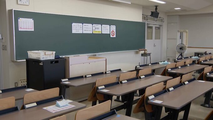 17日の大学入学共通テストを前に、職員が黒板に注意事項を掲示したり、机の上に受験番号が書かれたシールを貼ったりしていました。