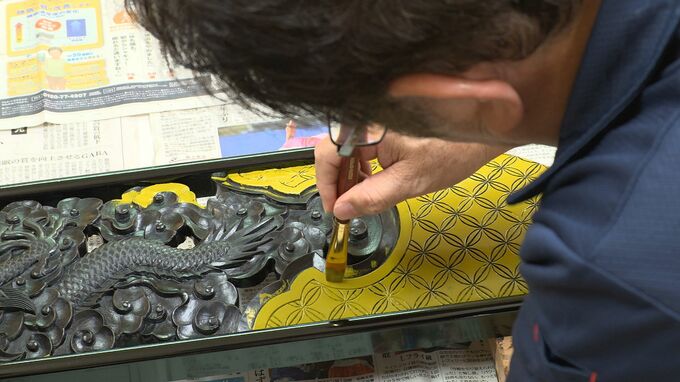 この日行われた「上塗り」の工程では漆職人の諸見由則さんらが筆を何本も使い分けて立体的な彫刻に丁寧に黄色の漆を塗っていました。