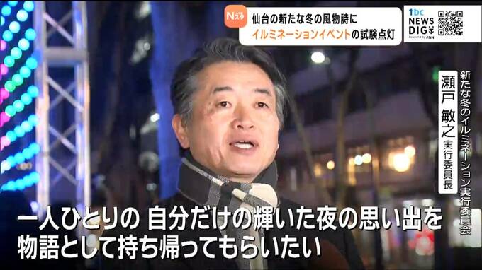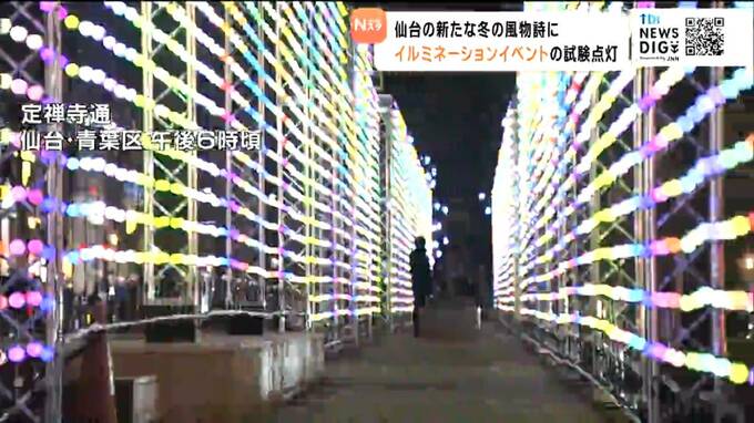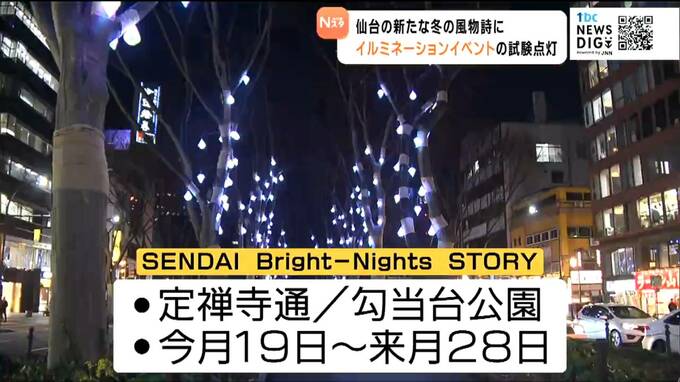 仙台市青葉区の定禅寺通では午後6時に新たなイルミネーションイベント「SENDAI Bright-Nights STORY」の試験点灯が行われ、関係者らが不具合がないか確認しました。1万6000個の電球による光の壁が150メートル続く「ChromawaveWall」など定禅寺通と勾当台公園の合わせて4つのエリアで光の演出を楽しむことができます。