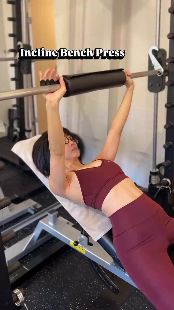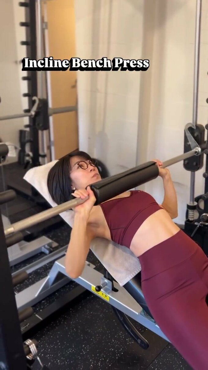 1種目めは「Incline Bench Press」(インクライン・ベンチプレス)。傾けたベンチに仰向けになり、マシンのバーを胸の筋肉と腕全体で真上に突き上げるエクササイズで、時東さんは気持ち背中を反らせた姿勢でテンポ良く動作を続けています。