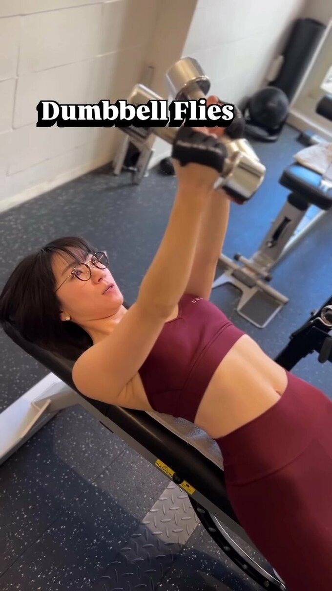 2種目めは「Dumbbell Flies」(ダンベルフライズ)。こちらは水平のベンチに仰向けになり、ダンベルを両手に握った状態で、水平に開いた両腕を真上に向かって胸の前で閉じるエクササイズで、こちらでも時東さんは、かなりのテンポで動作。腹部の縦筋や上腕部の筋肉の影などがくっきりと出ていて、日頃継続して鍛えていることが想像できます。