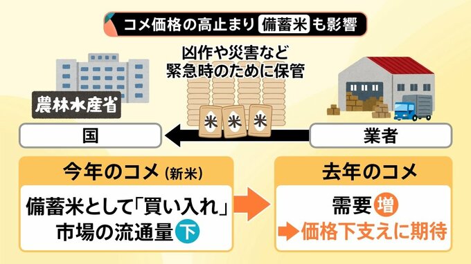 政府が備蓄米として新米を買い入れると、市場の流通量が減るため、その分、溜まっている2025年のコメの需要が増えるとみられています。