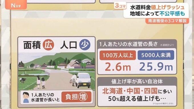 水道料金が値上がりしやすいのは、面積が広く人口が少ない自治体で、一人あたりの水道管が長いため、負担も増えるということです。