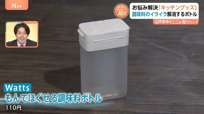 容器の中で、調味料が固まって出てこないという時には、Wattsの「もんでほぐせる調味料ボトル 110円」。