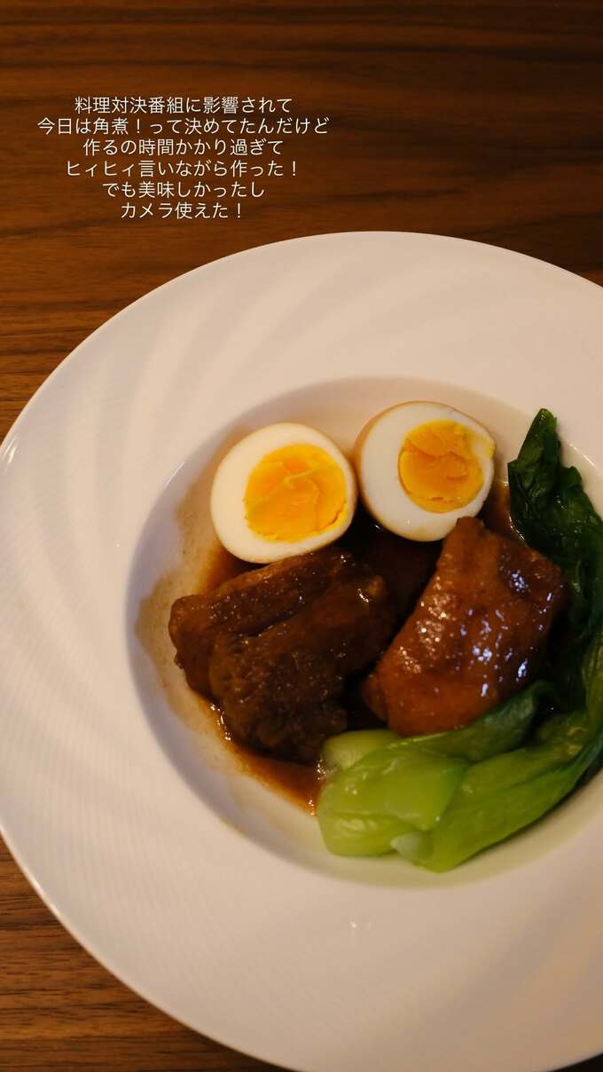 村重さんは「料理対決番組に影響されて」「今日は角煮!って決めてたんだけど」とテキストを貼った写真を投稿。そこには、白いお皿に盛られ、半熟の味付け卵と茹でた青梗菜が添えられた、つやつやに仕上がった豚肉の角煮が登場しています。