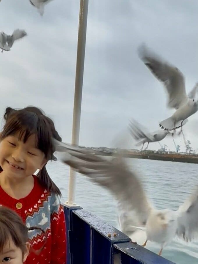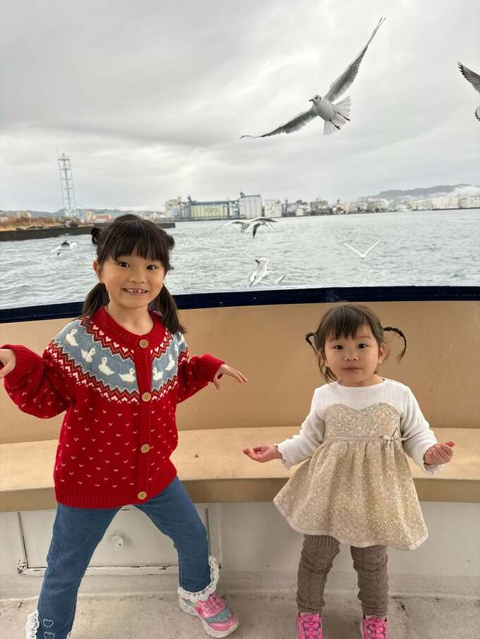 続けて、「清水港クルーズではデッキに出るとエサやりを待つユリカモメたちがたくさん集まってきました」と〝カモメアタック〟を受ける前後の様子と思われる、カモメがたくさん背景に映っている写真や、カモメポーズをするののちゃんと妹・ひーちゃんの写真も掲載されており、楽しそうな様子が伺えます。