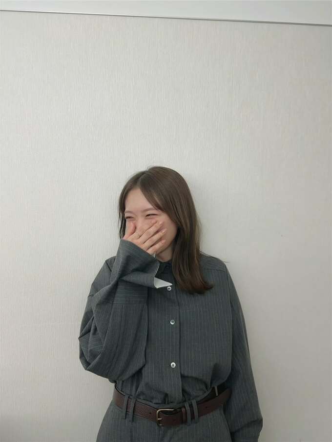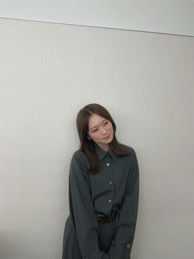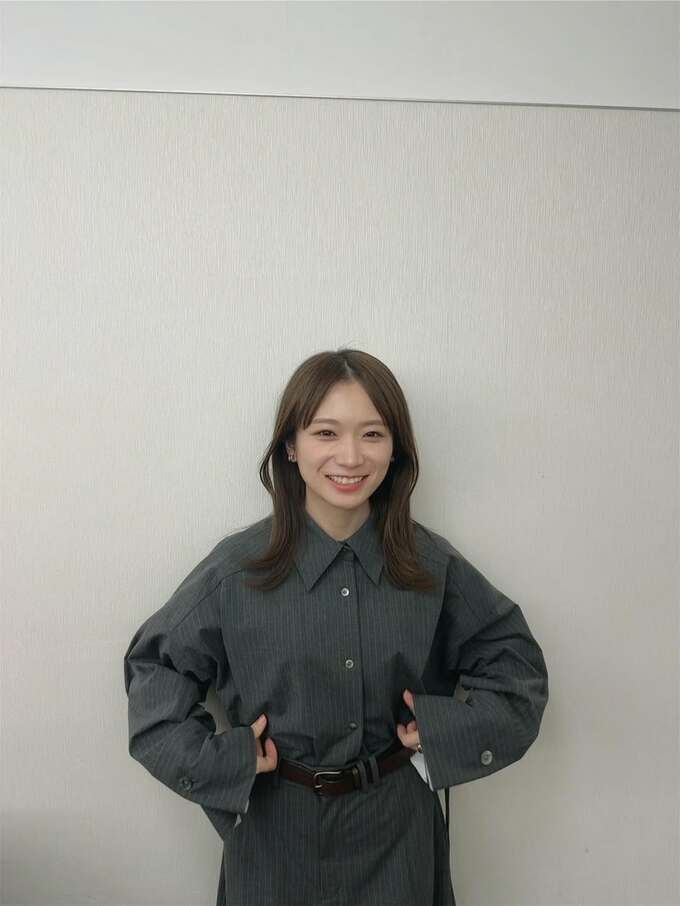 秋元さんは「おでこ出してみた〜」とテキスト。白い壁を背にして、濃いグレーのシャツ型ワンピースを着こなし、ちょっと照れたような表情で小首をかしげています。そんな秋元さんの前髪はきれいに分かれていて、額がしっかり出ています。