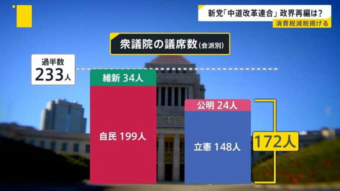 「中道改革連合」に立憲と公明の会派に属する衆院議員全員が参加した場合、議席数は172。自民の199議席に迫る規模となります。