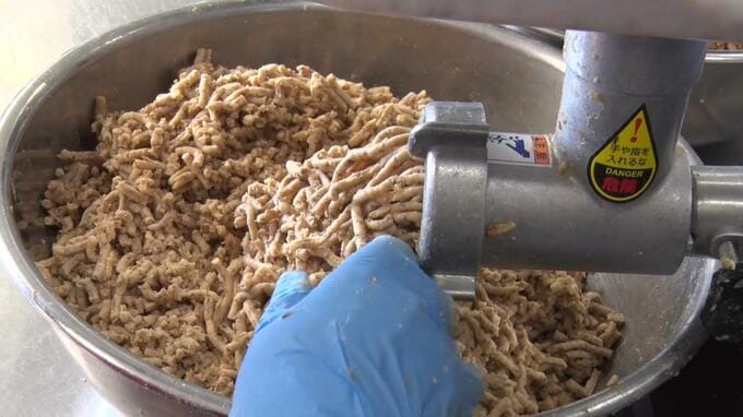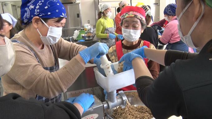 参加者は蒸して麹菌を混ぜた「高アンダー」をミンチ状にして空気が入らないよう押さえながら容器に詰める作業を体験していました。