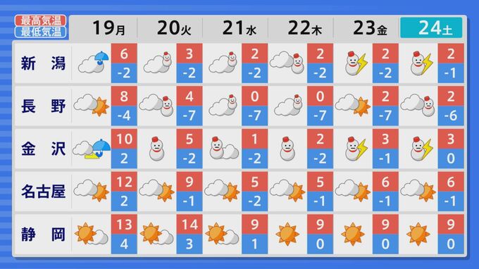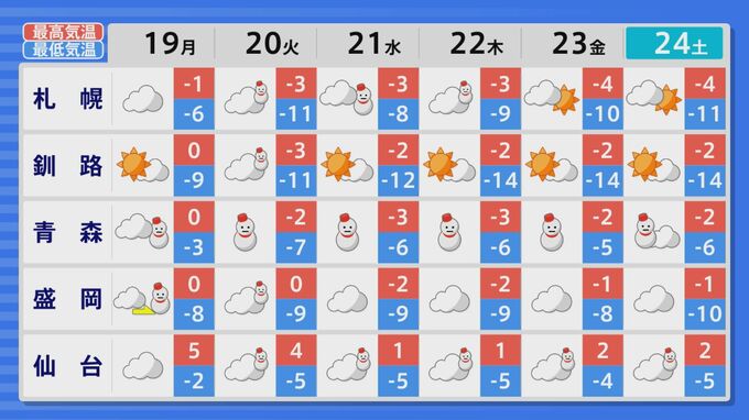 【大雪情報】週明け20日(火)を境に“強烈寒波”が到来 冬型気圧配置が持続し日本海側では大雪が続くおそれ 雪・雨と風シミュレーション 北陸放送 2026年1月17日(土) 18:53 国内 強い冬型は20日以降続きそうで、日本海側を中心に大雪の状態が持続し、ところによっては積雪量がかなり多くなるおそれがあります。 北陸では、20日あたりから雪が降るでしょう。金沢では21日以降気温がかなり低く、21日は予想最高気温が1度です。21日以降、最低気温が氷点下の冬日になる厳しい寒さになる見込みです。 東北や北海道も、日本海側を中心に週明けから雪が降りそうですが、最高気温が氷点下の真冬日のところもあるでしょう。 来週は、雪への備えが必要になるでしょう。北陸など日本海側の地域では、交通障害などに注意・警戒が必要になりそうですが、低温によって生じる水道管の凍結といったトラブルにも注意を払ったほうがよさそうです。 冬型が強まれば、大雪にとどまらず暴風のおそれもあります。最新の気象の情報に注意をするようにしてください。