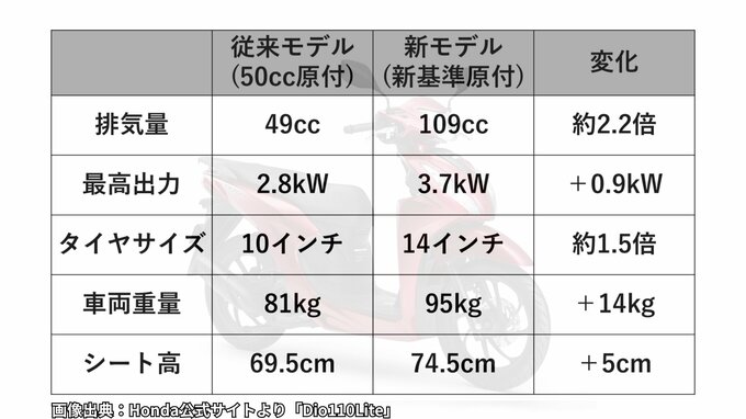 これまでのモデルと今後主流となる「新基準」のモデルでは、何が変わるのか。ホンダ「Dio」の新旧モデルを比較してみよう。