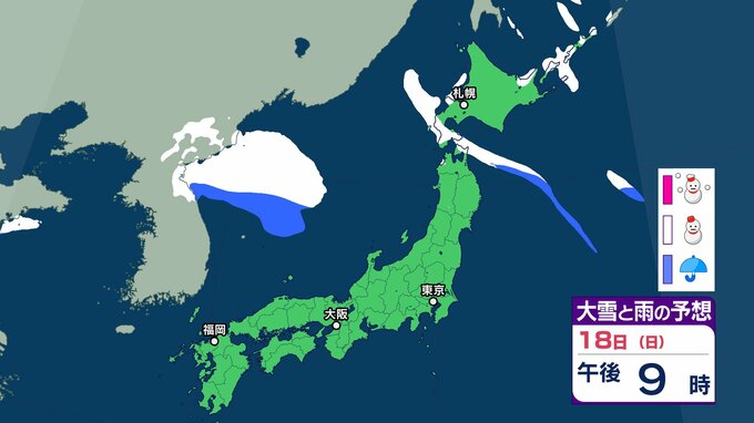 気象庁の雪と雨のシミュレーションによると、北海道や北陸の一部で雪が降る予報です。
