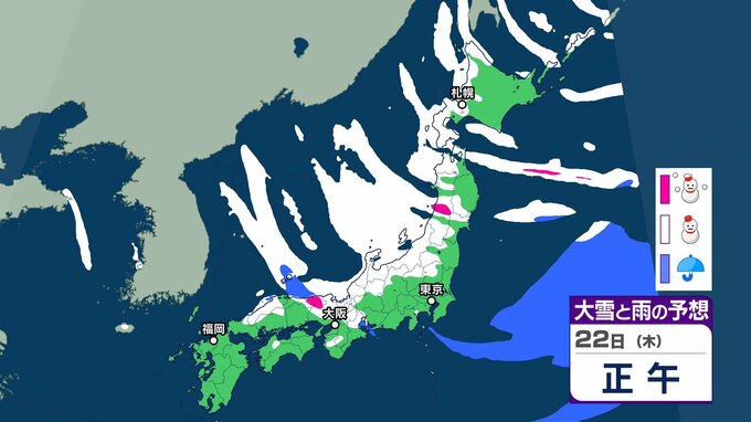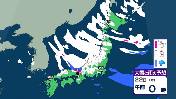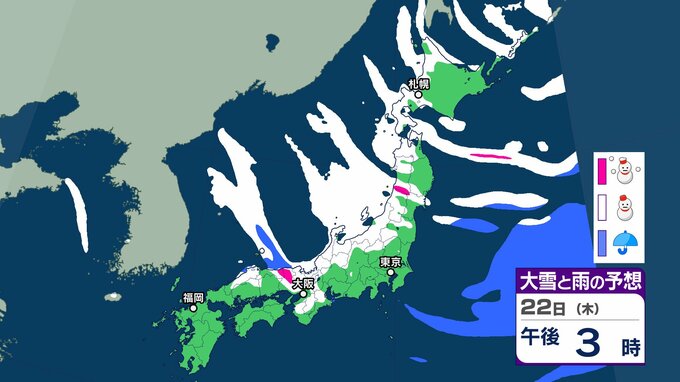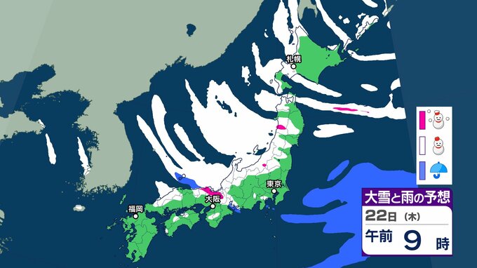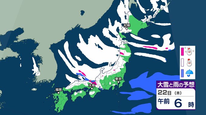 【雪の予想】北日本では20日にかけて 東~西日本は20日大雪による交通障害に注意・警戒を【気象庁 18日(日)~23日(金)の雪雨シミュレーション/18日午後1時】 RSK山陽放送 2026年1月18日(日) 13:33 国内 天気 22日(木) 気象庁の雪と雨のシミュレーションをみると、22日は、東北や近畿の一部などで大雪となるところもある見込みです。