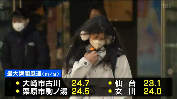 午前11時までの最大瞬間風速は、大崎市古川で24.7メートル、仙台で23.1メートルなど県内のおよそ半数の観測地点で20メートル以上の風が吹きました。