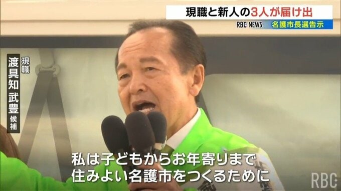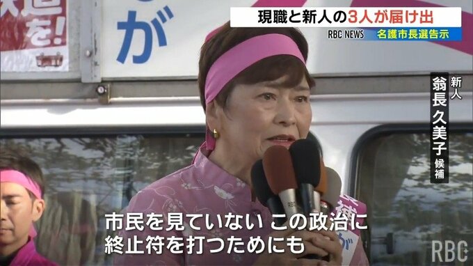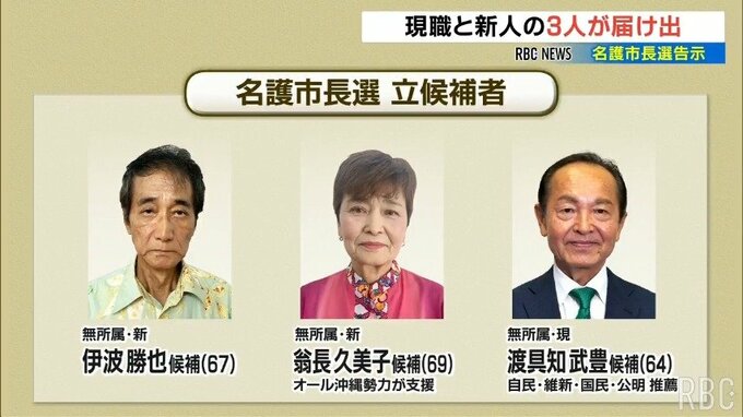 名護市長選挙には届け出順に3人が立候補を届け出ていて、選挙戦は事実上、前の名護市議の翁長久美子さんと、現職の渡具知武豊さんによる一騎打ちとなる見通しです。
