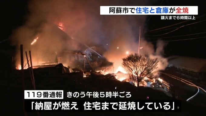 警察や消防などによりますと、17日午後5時半ごろ、阿蘇市波野の住宅で「納屋が燃え、住宅まで延焼している」と119番通報がありました。