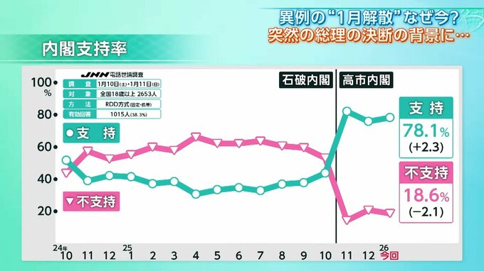 ひとつに「支持率」があります。最新のJNNの世論調査では高市内閣の支持率は78.1%、政権発足以来、8割前後を維持しています。