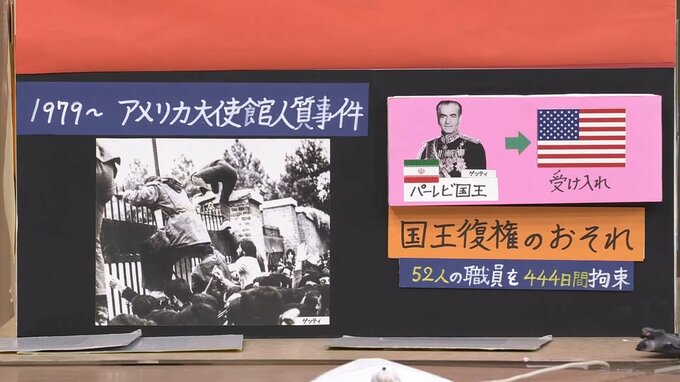 そして、その怒りが爆発したのが1979年、宗教指導者ホメイニ師が主導した「イラン革命」でした。その直後に起きたのが「アメリカ大使館人質事件」です。革命により再び国を追われた「パーレビ国王」をアメリカが受け入れたため、復権を恐れた学生らが引き渡しを求めて大使館を占拠。52人の職員を444日間もの間、拘束しました。