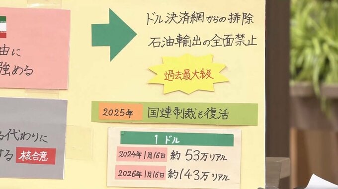 一度は国際社会への復帰が見えたイラン。しかし、トランプ氏は第一次政権の時に「核合意」から一方的に離脱、ドル決済網からの排除や、石油輸出の全面禁止など過去最大級の制裁を再開しました。さらに、2025年9月には国連制裁も復活したことによって、イランの通貨価値は2年間で3分の1まで暴落しました。