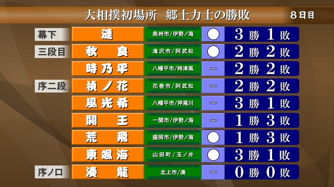 大相撲初場所中日8日目の岩手県出身の郷土力士の勝敗です。