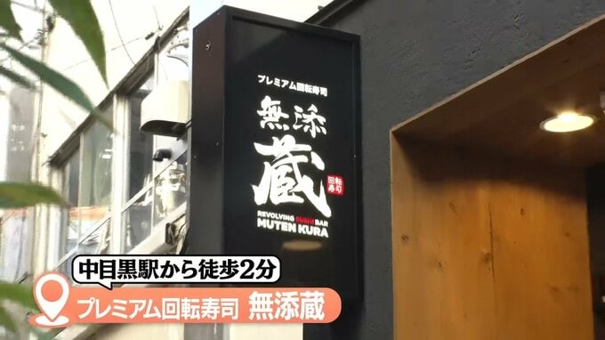 中目黒駅すぐ近く、高級感が漂う「プレミアム回転寿司 無添蔵」。